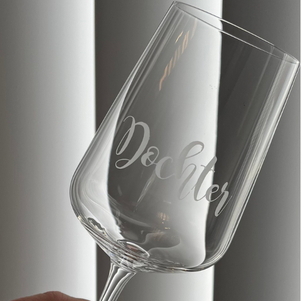 Een stijlvol wijnglas, theeglas of waterglas gegraveerd of bedrukt met een naam, datum of korte tekst naar wens.